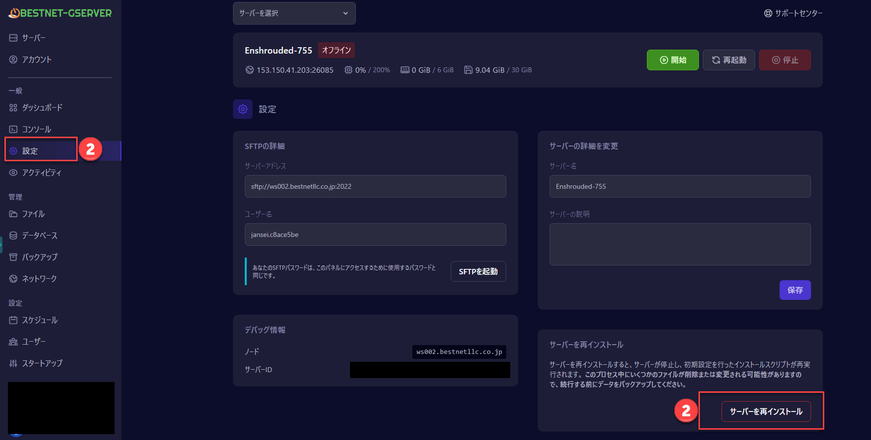 設定ページの右下に「サーバーを再インストール」のボタンがあります。下記の画像で②の位置です。クリックすると確認ダイアログが表示されます。