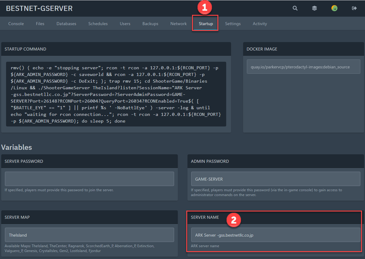 ゲームパネルから簡単にゲームブラウザ上で表示されるサーバー名を変更できます。 ’Startup’タブから’SERVER NAME’の項目で管理者パスワードを設定可能です。