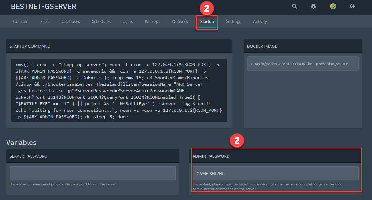 ゲームパネルから簡単に管理者パスワードを変更できます。 ’Startup’タブから’ADMIN PASSWORD’の項目で管理者パスワードを設定可能です。