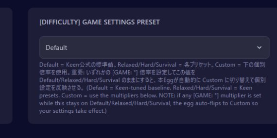 • 難易度の倍率系変数: プリセットが Custom のときのみ有効です。Default/Relaxed/Hard/Survival を選んでいる場合、個別の倍率変数を変更しても無視されます。