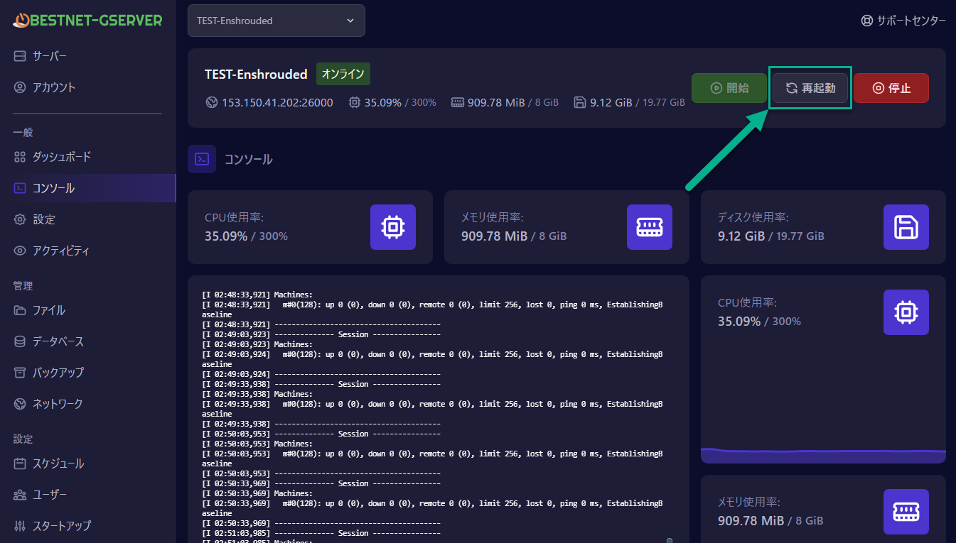 💡 ヒント: 設定変更後の再起動は、ゲームパネル上部の「Restart」ボタンで実行できます。再起動中は最大30秒ほどダウンタイムが発生します。