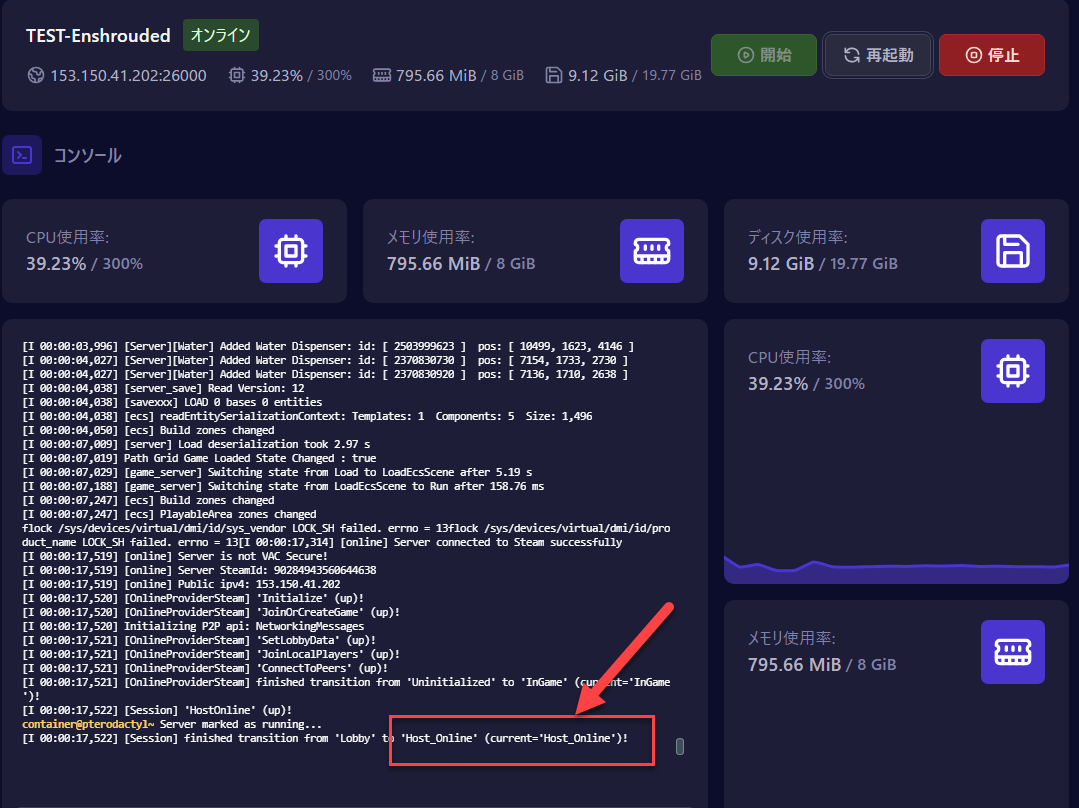 ゲームパネルの「Console」タブで起動ログを確認できます。[Session] 'HostOnline' (up)! が表示されれば正常起動です。