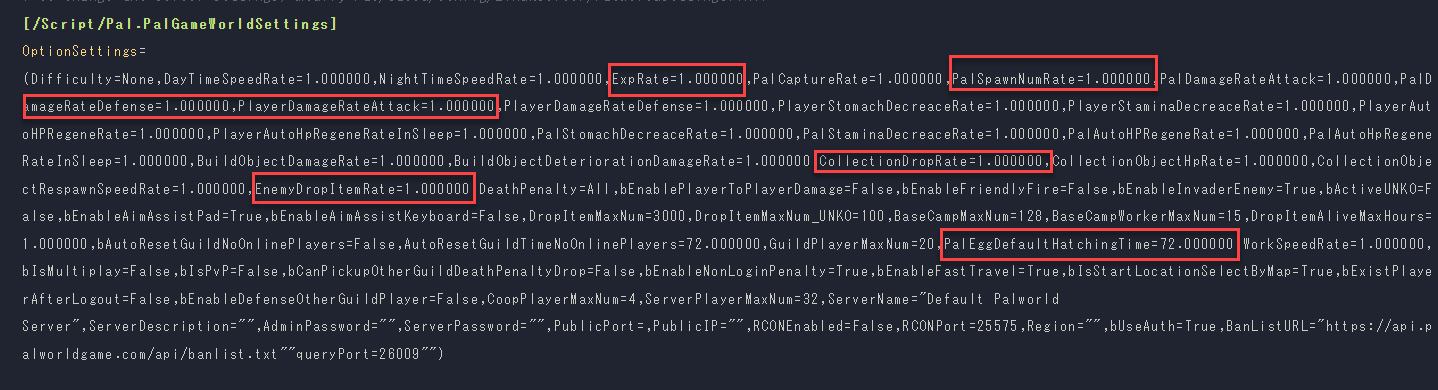 ゲームパネル内のファイルブラウザで簡単に設定する事ができます。 ’Files’タブに移動し’DefaultPalWorldSettings.ini ’をクリックして開きます。 判別しにくいのでファイル内でctrl+fを押す事で文字検索をしてください。 以下はパラメータの解説になります。