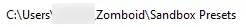 - 13.次のディレクトリを見つけますC:Users[Username]ZomboidSandbox Presets。