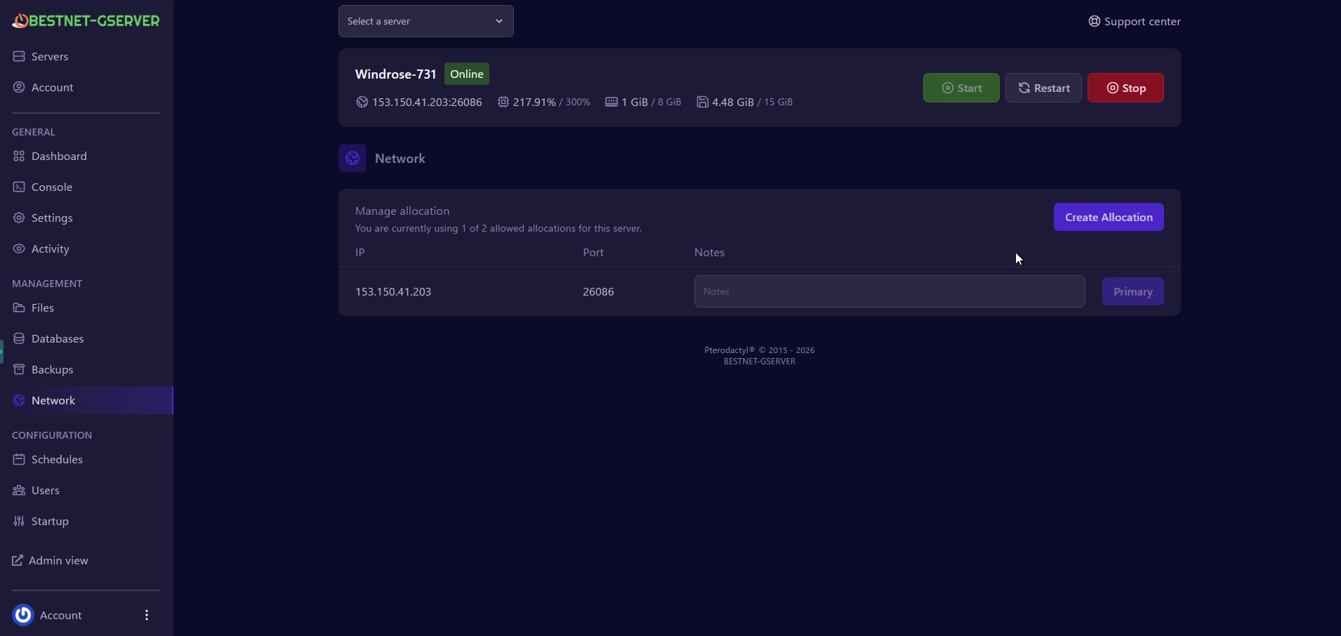 ゲームパネルの左メニュー「Network」タブに移動し、「Create Allocation」ボタンを1回押してください。