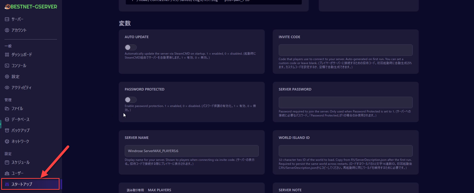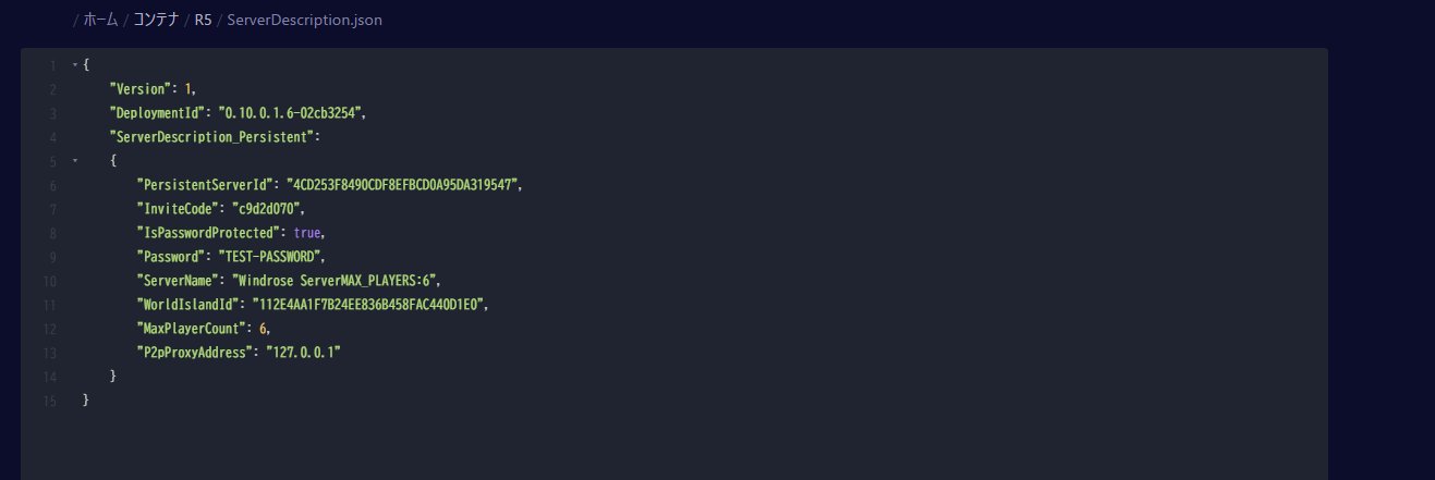 Windroseサーバーでは R5/ServerDescription.json を直接編集しても、サーバー起動時にStartupタブの設定値で自動的に上書きされます。パスワードを含むすべてのサーバー設定はStartupタブから行ってください。